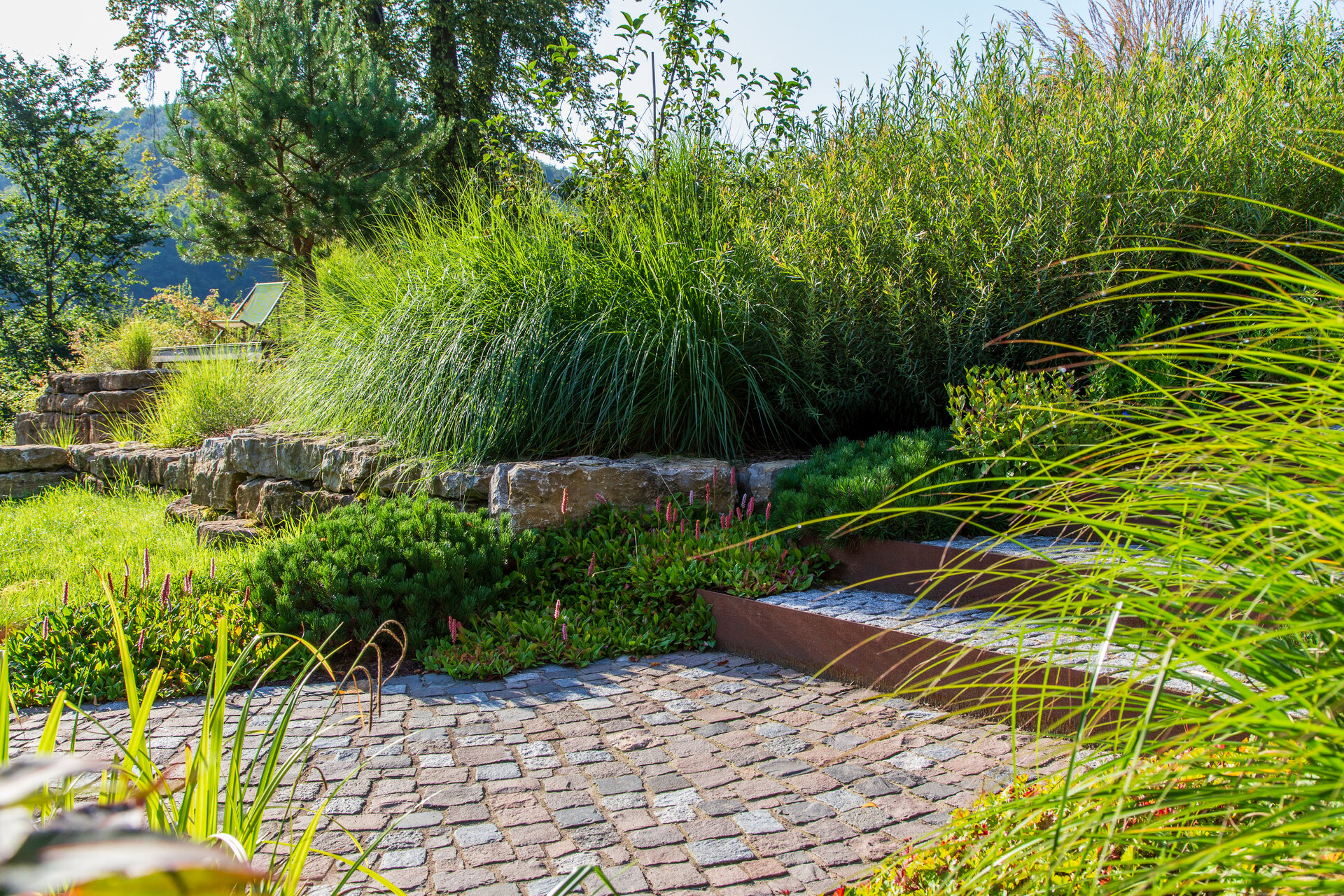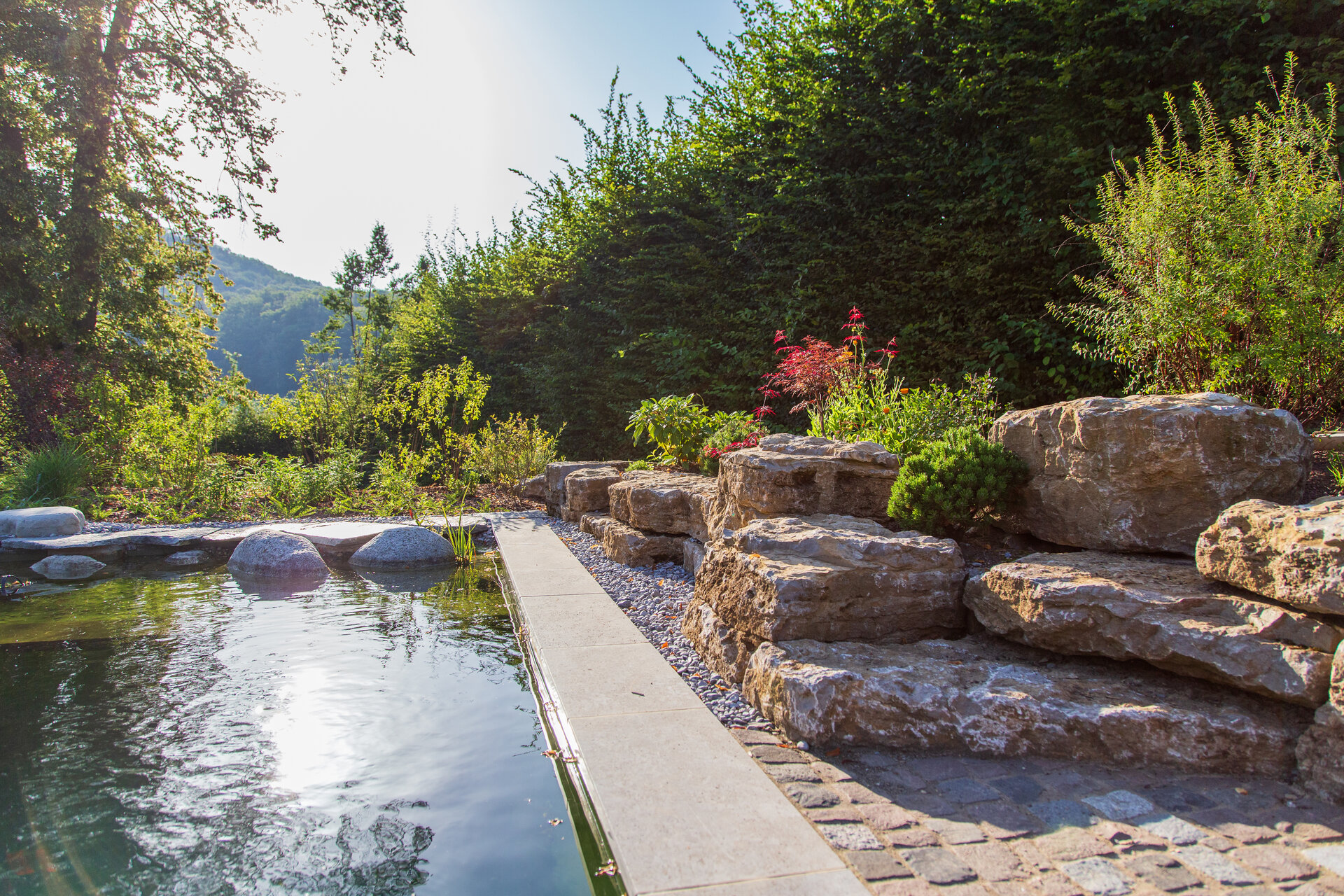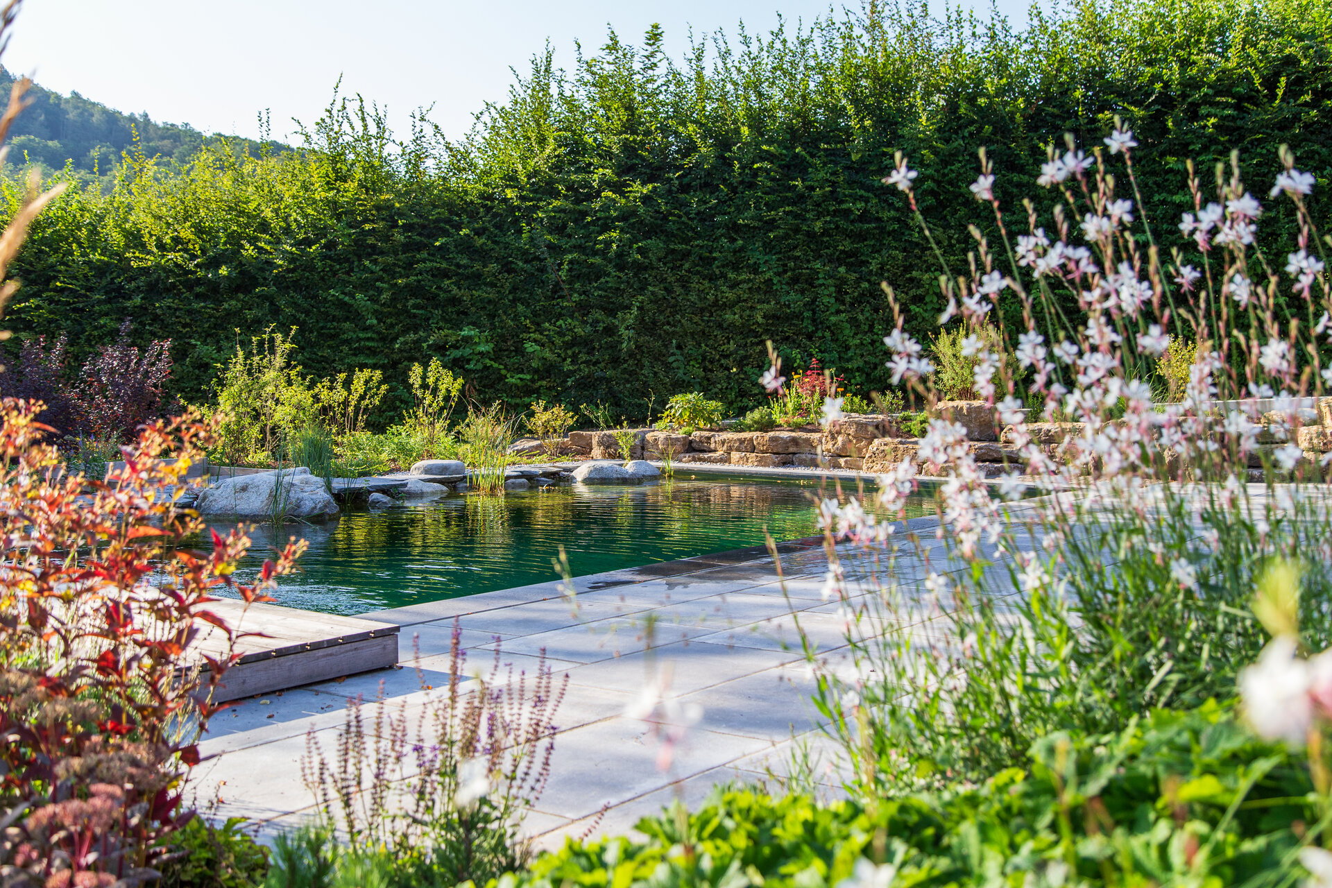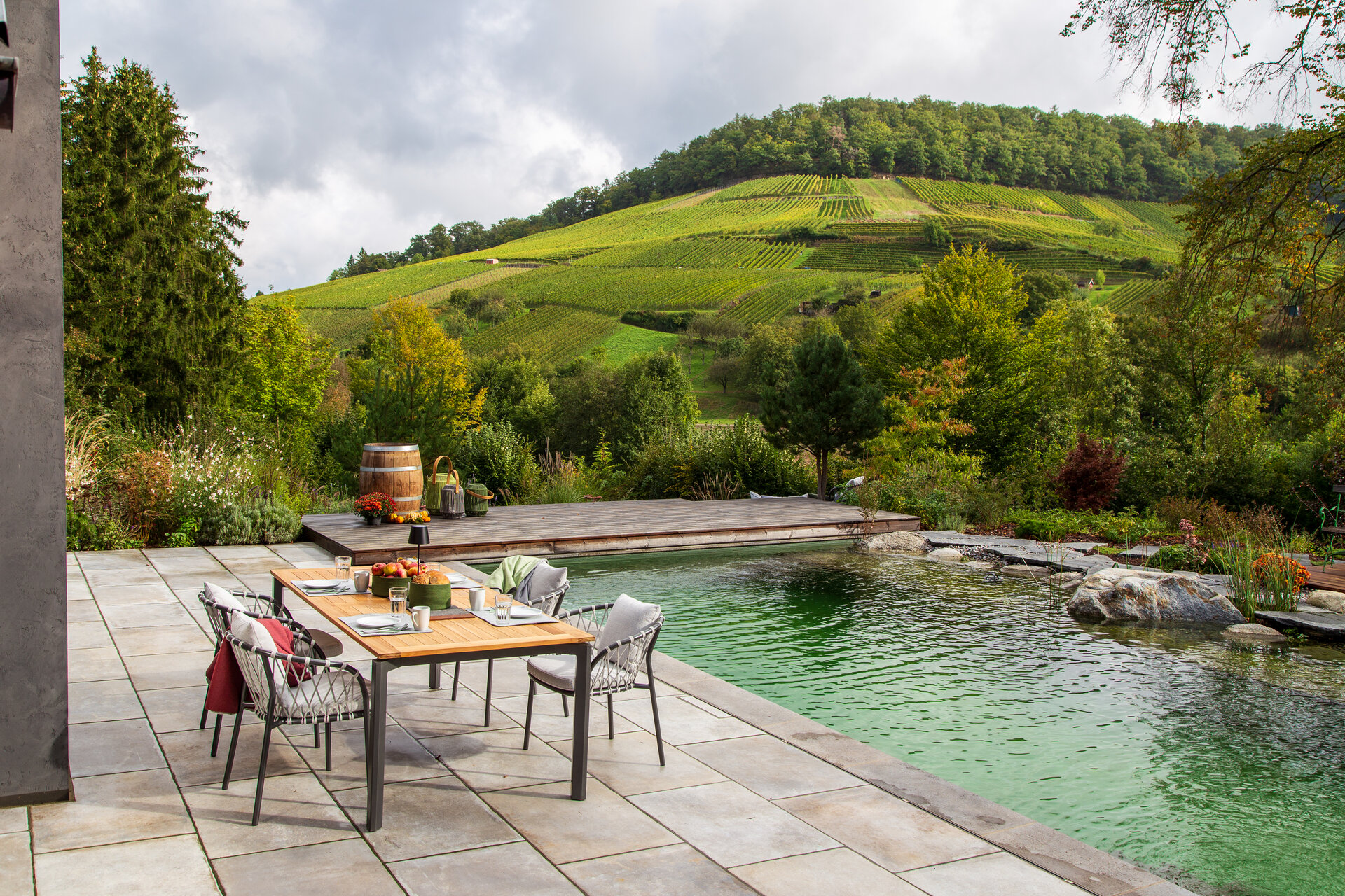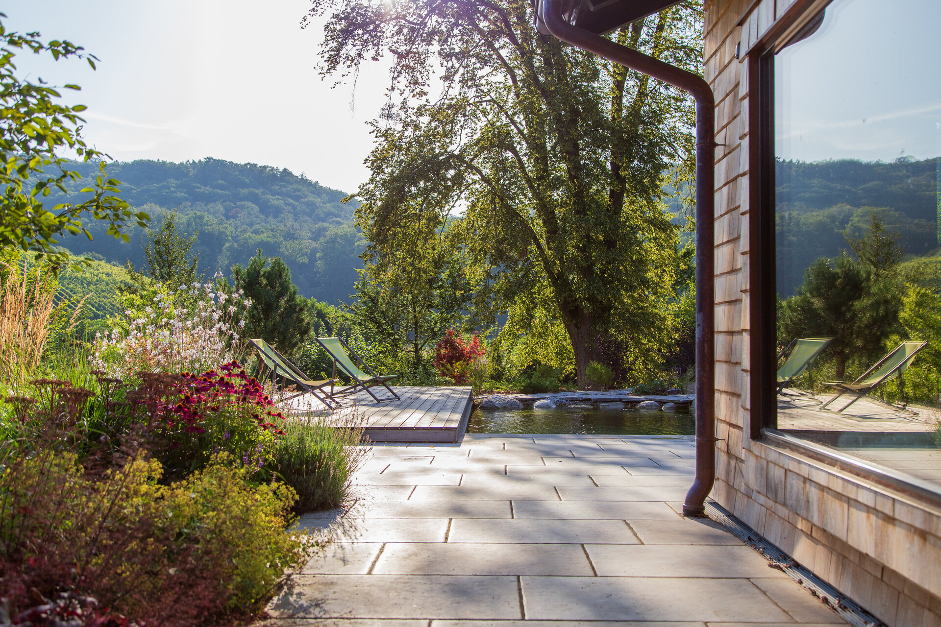 Besondere Rückzugsorte sind die Holzdecks im Hang, die in die Pflanzung eingebettet sind und einen erhöhten Blick in die Weinberge bieten. Das Herzensprojekt des Hausherrn, der Pool (liebevoll „Löschteich“ genannt), verzichtet auf einen klassischen Beckenrand. Stattdessen bildet ein polygonaler Schrittplattenweg aus Naturstein am Wasser, durchzogen von Gräsern und Uferpflanzen, einen visuell poetischen Übergang zur Umgebung.