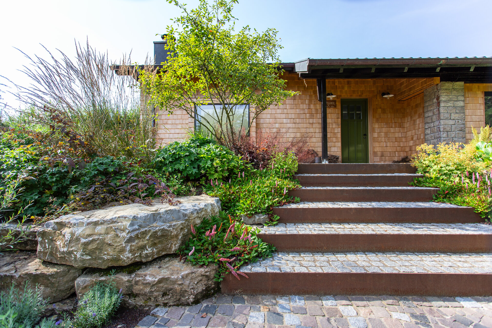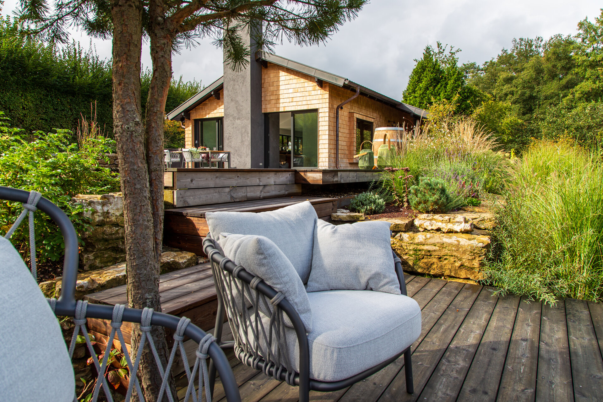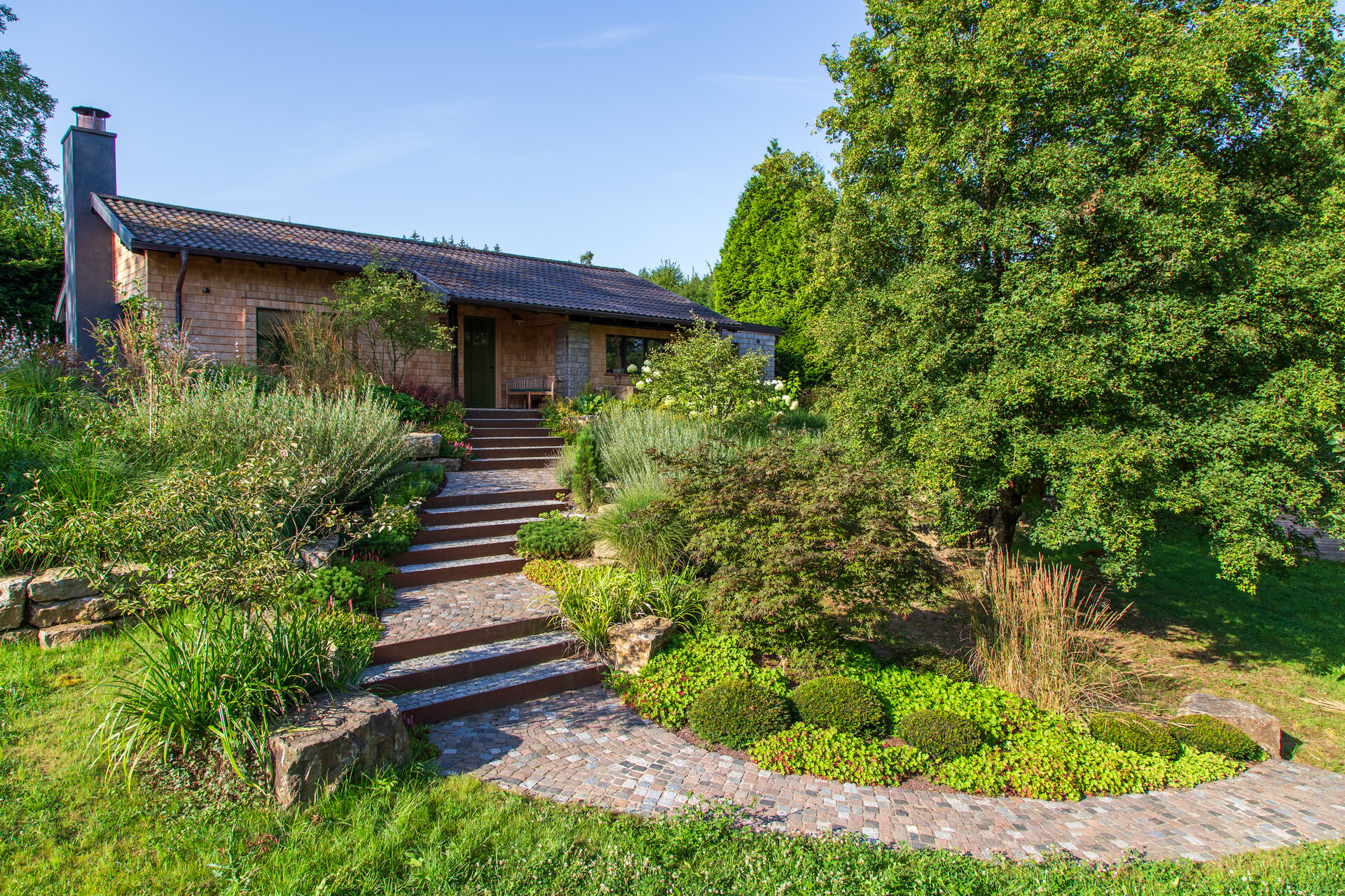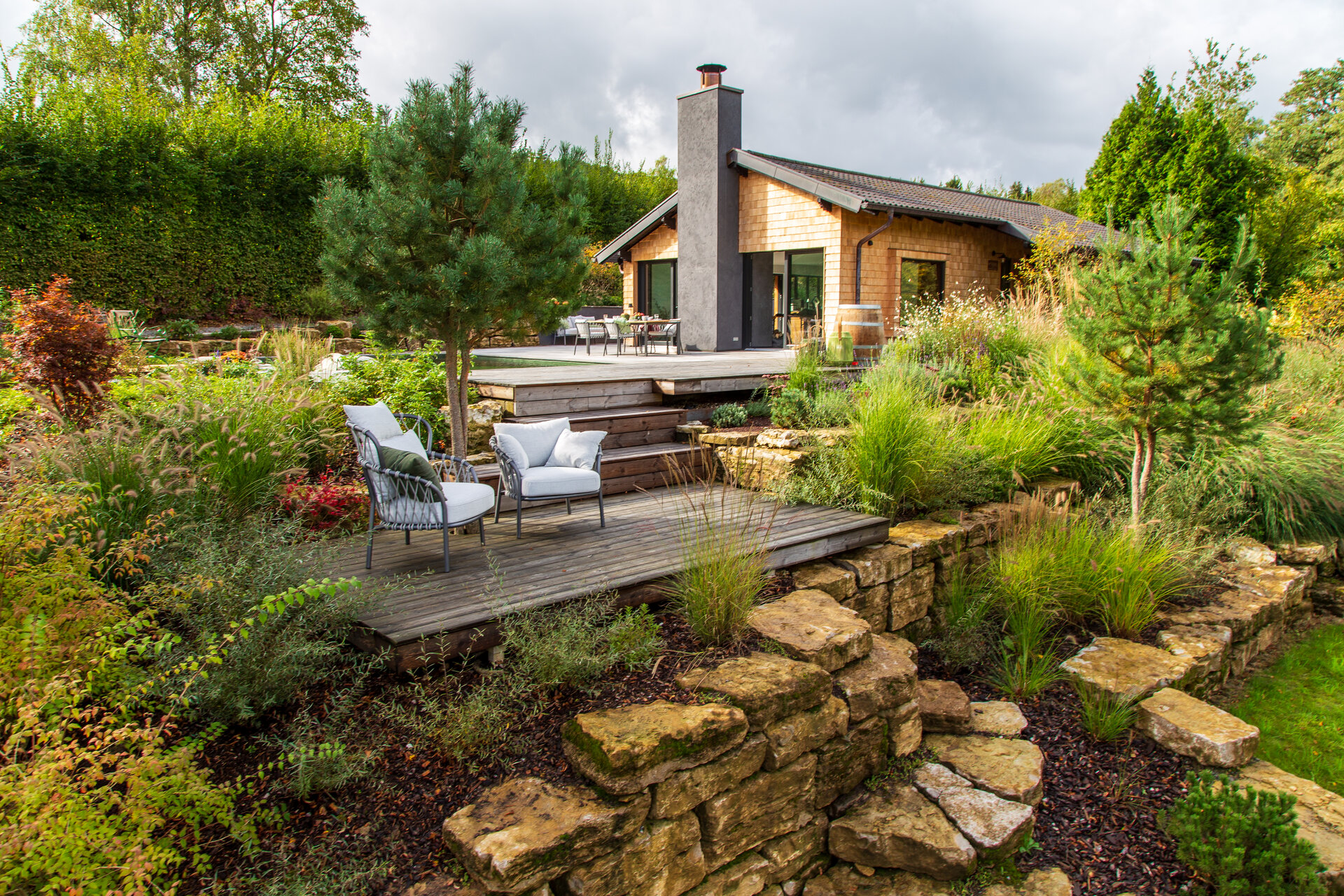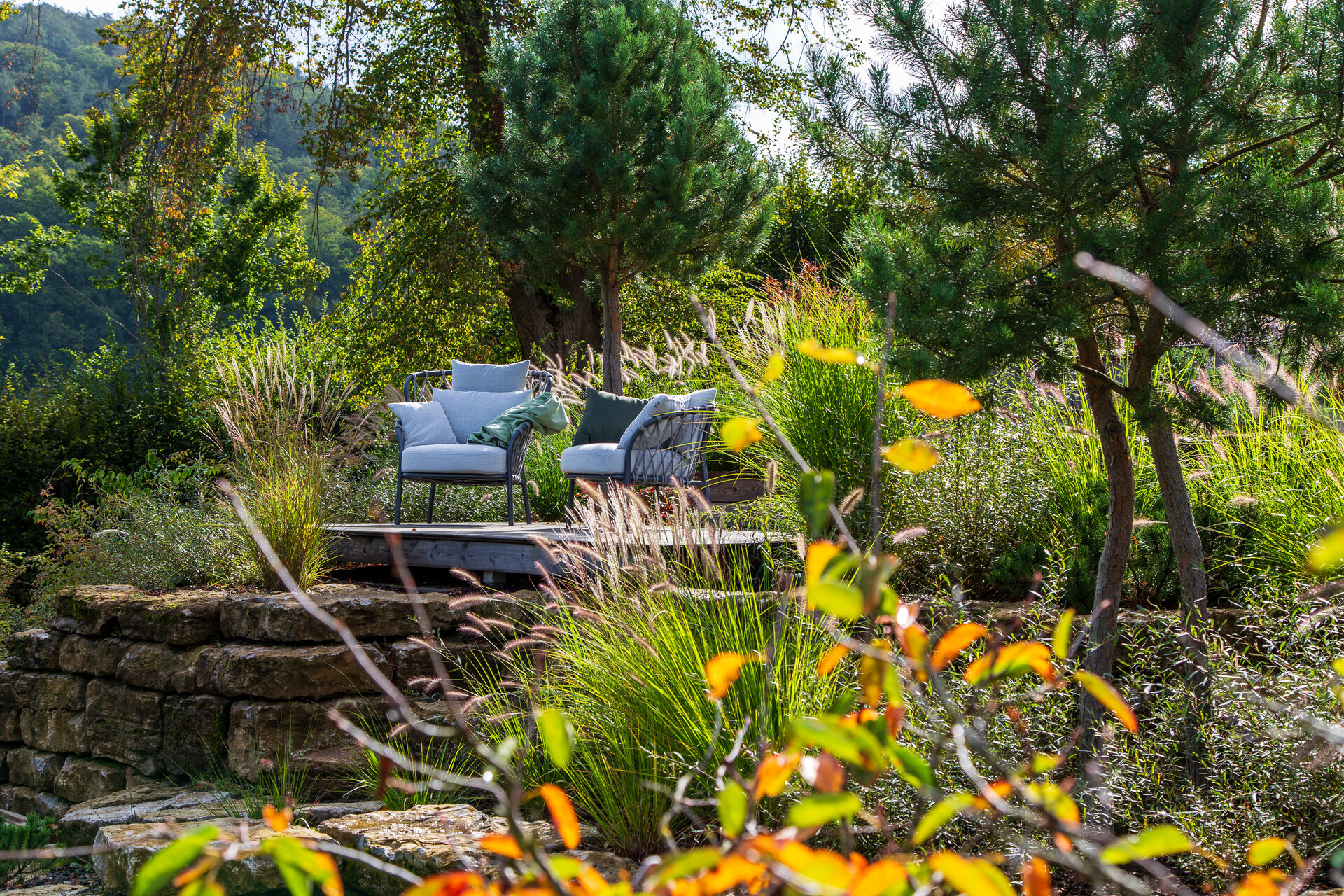 Da die Eigentümer die Hütte vor allem im Herbst genießen, wurde die Bepflanzung entsprechend gewählt: Kupferfelsenbirnen, japanische Ahorne und strukturstarke Gräser dominieren die Szenerie in leuchtenden Farben. Staudenbeete in Haus- und Poolnähe bieten das ganze Jahr über Blütenfülle bei geringem Pflegeaufwand.